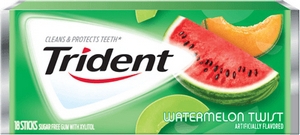 - Жевательная резинка без сахара Trident Original Watermelon Twist (Сочный вкус спелого арбуза) с ксилитом, 18 пластинок. Trident - первая национальная Американская жевательная резинка без сахара! В ее рецепте сахар был заменен на ксилит, что резко снизило вероятность заболевания кариесом. Это была одной из первых жевательных резинок, одобренных стоматологами.